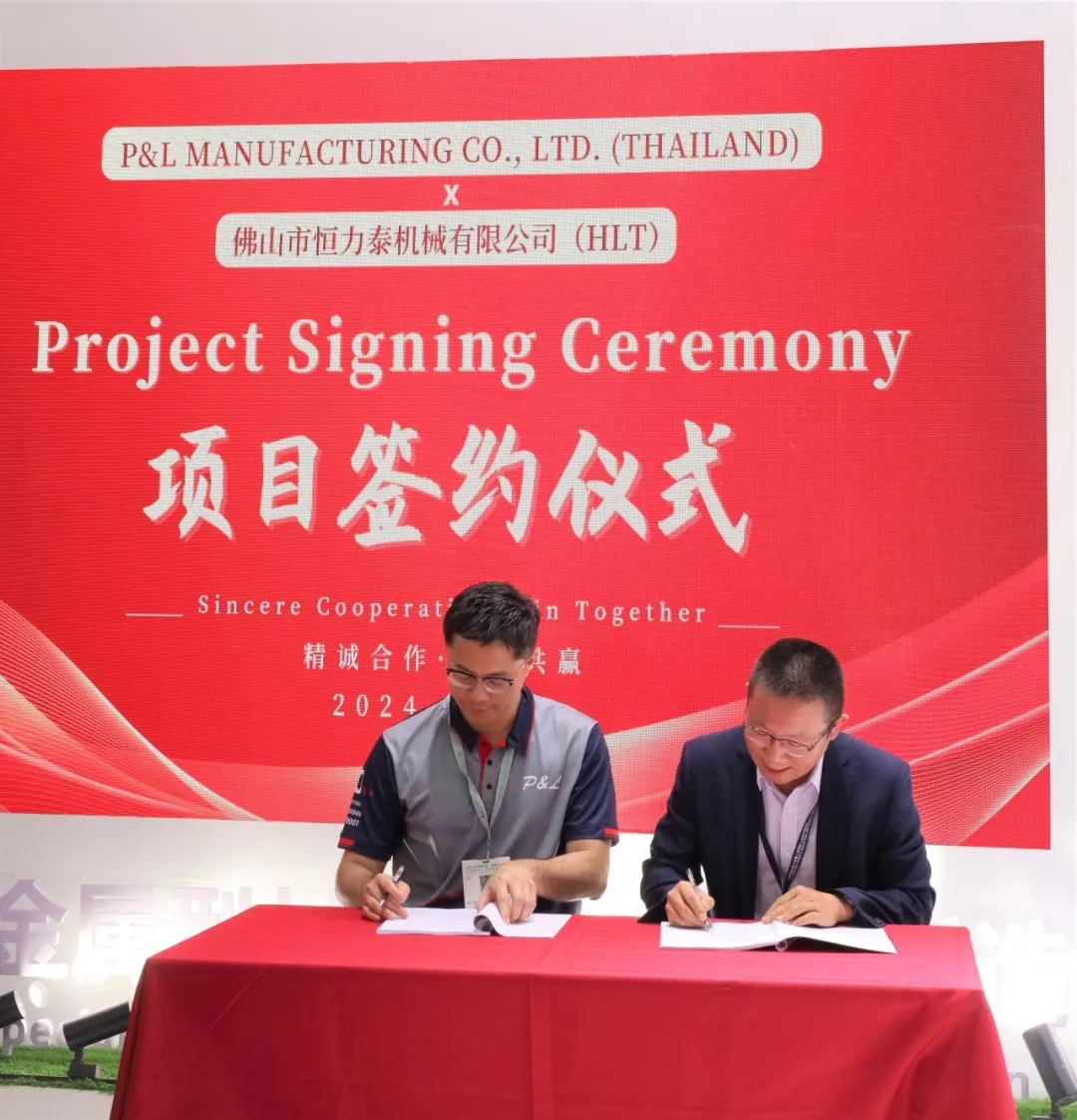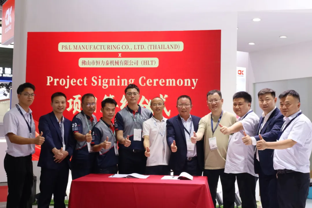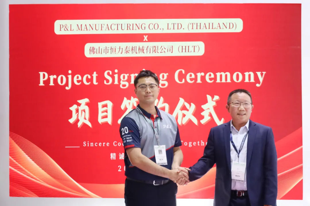 HLT Machinery has been able to stand out from its competitors with its strong R&D capabilities and pursuit of excellence in quality. At 14:00 that afternoon, it reached a cooperation agreement with P&L MANUFACTURING CO., LTD. Lin Jialong, general manager of P&L, and Qin Jie, general manager of HLT Extrusion Machine Division, held and completed the project signing ceremony at the booth.