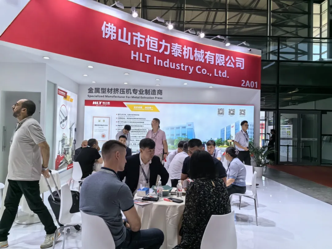 The popularity of the HLT Machinery booth continued to rise. The YPL1100~YPL12500 series of aluminum profile extrusion machines attracted many customers from home and abroad to come for consultation and sit down for detailed discussions. The popularity of the scene once reached a climax.
